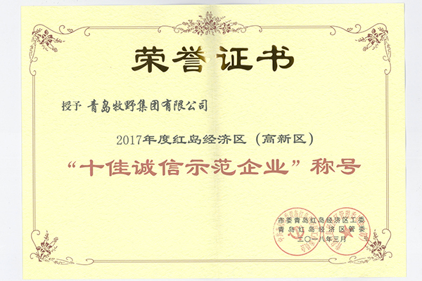 青島牧野集團(tuán)有限公司獲得市委青島紅島經(jīng)濟(jì)區(qū)工委、青島紅島經(jīng)濟(jì)區(qū)管委聯(lián)合授予的2017年度紅島經(jīng)濟(jì)區(qū)(高新區(qū))“十佳誠信示范企業(yè)”稱號(hào)
