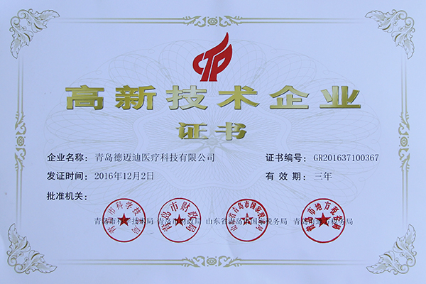 青島德邁迪醫(yī)療科技有限公司獲得青島市科學(xué)技術(shù)局&青島市財政局&山東省青島市國家稅務(wù)局&青島市地方稅務(wù)局高新技術(shù)企業(yè)證書;